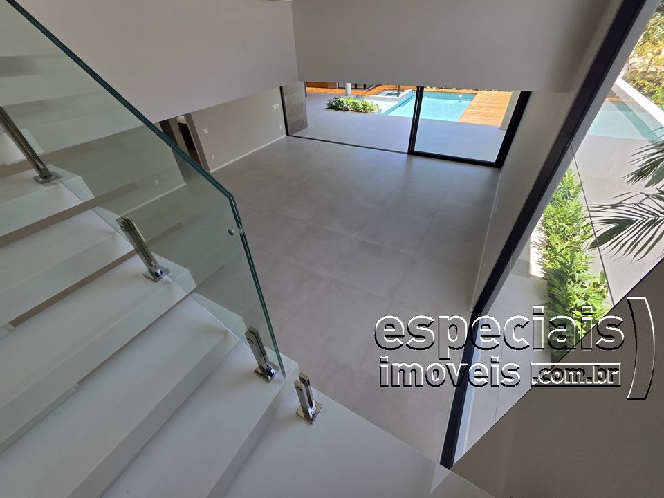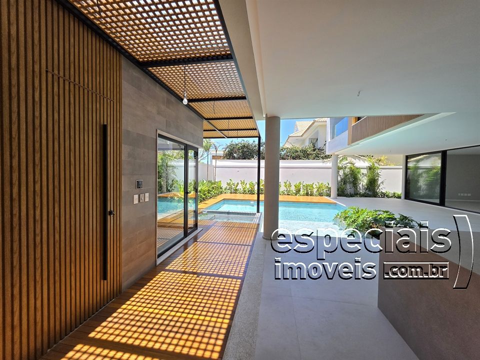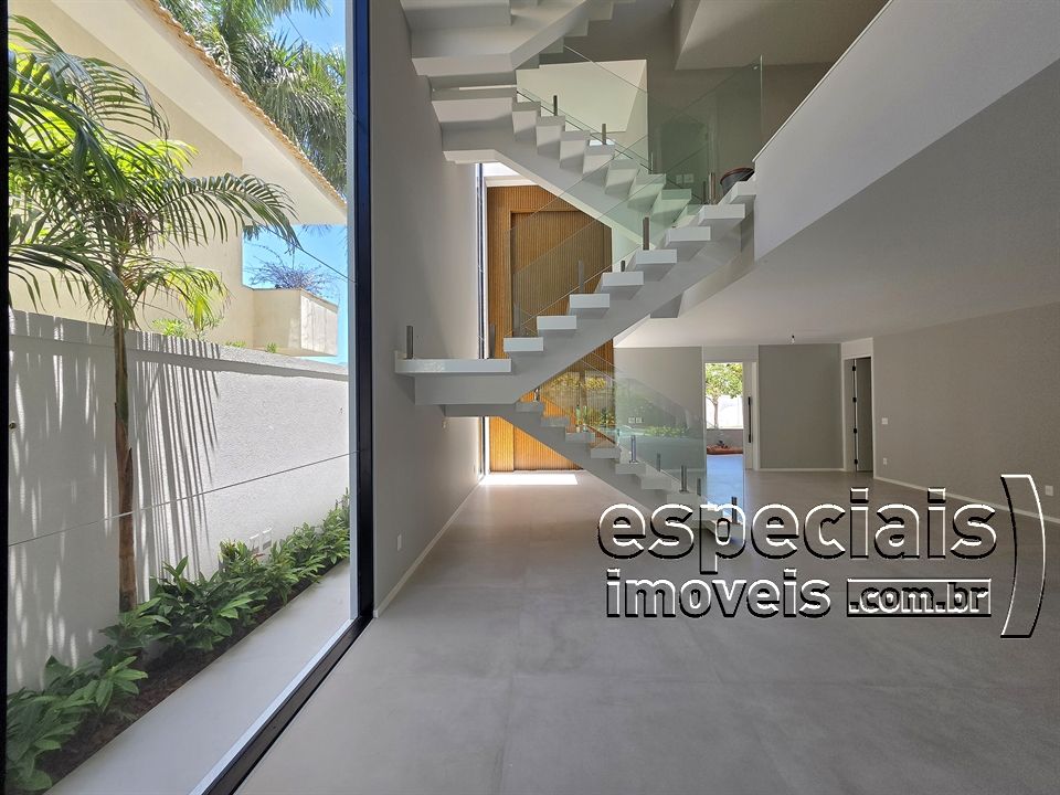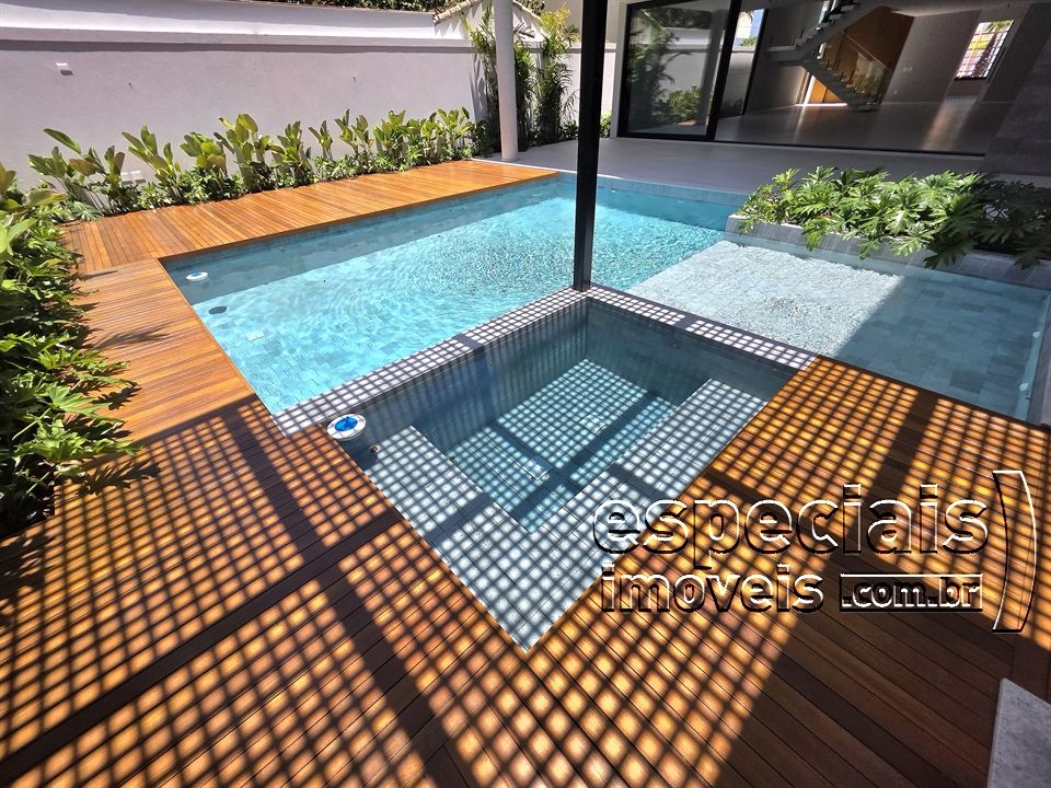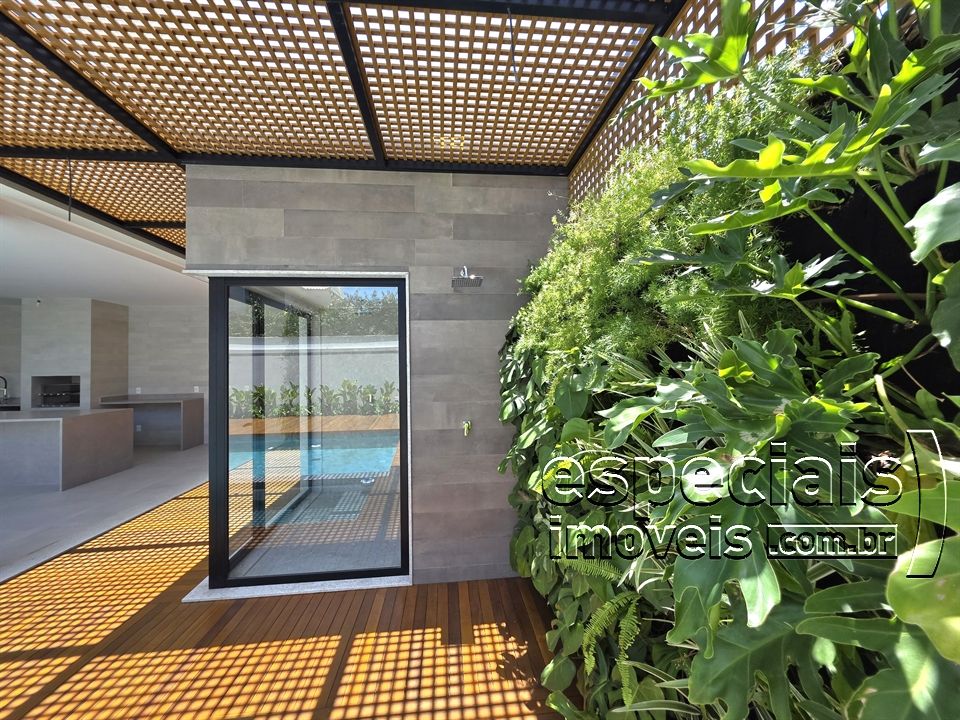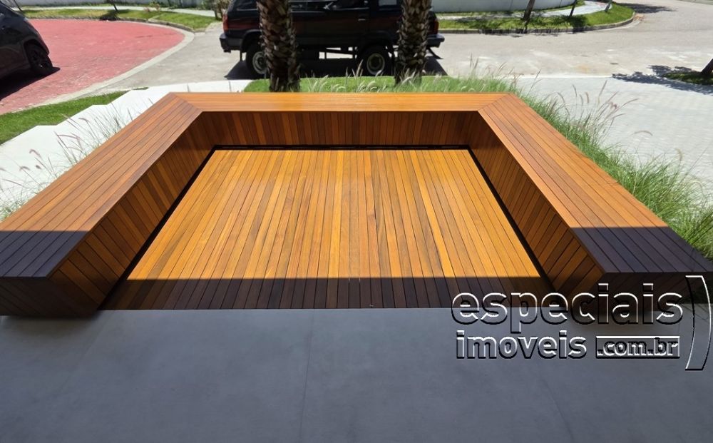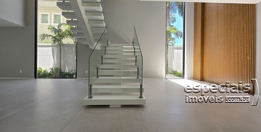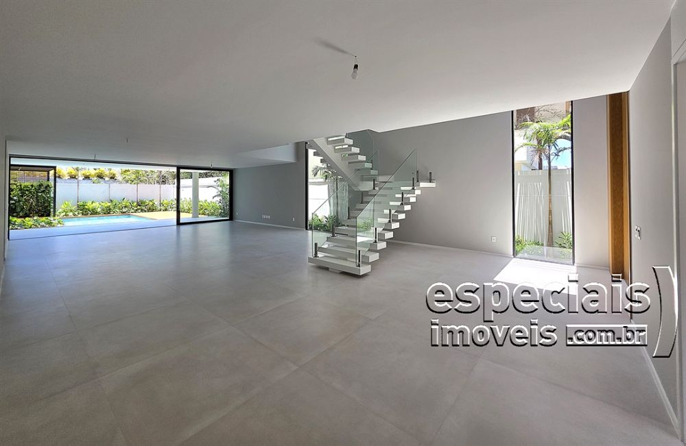 Primeiro pavimento: Hall social. Salão multiambiente com pé direito triplo. Lavabo. 1 Suíte. Copa. Cozinha com ilha. Área gourmet coberta com bancada completa (churrasqueira, forno a lenha e implementos) e ilha. Sauna. Banheiro de apoio. Deck, piscina e hidromassagem. Área de serviço/lavanderia e dependência completa de funcionários.