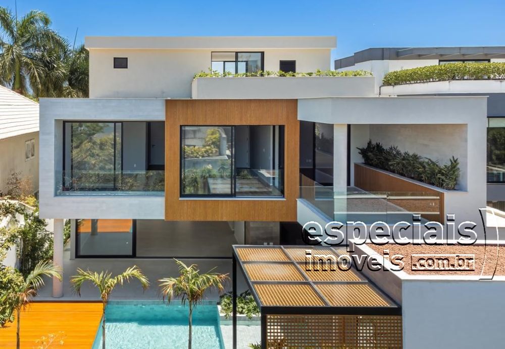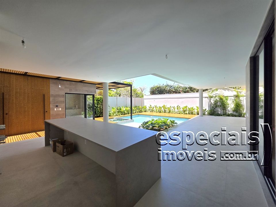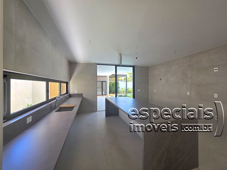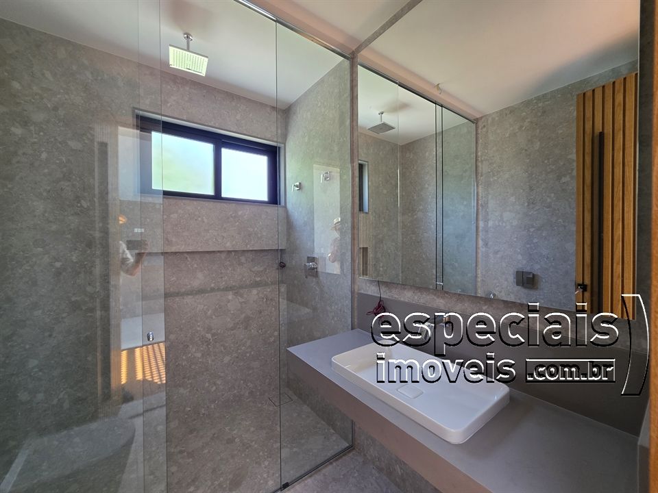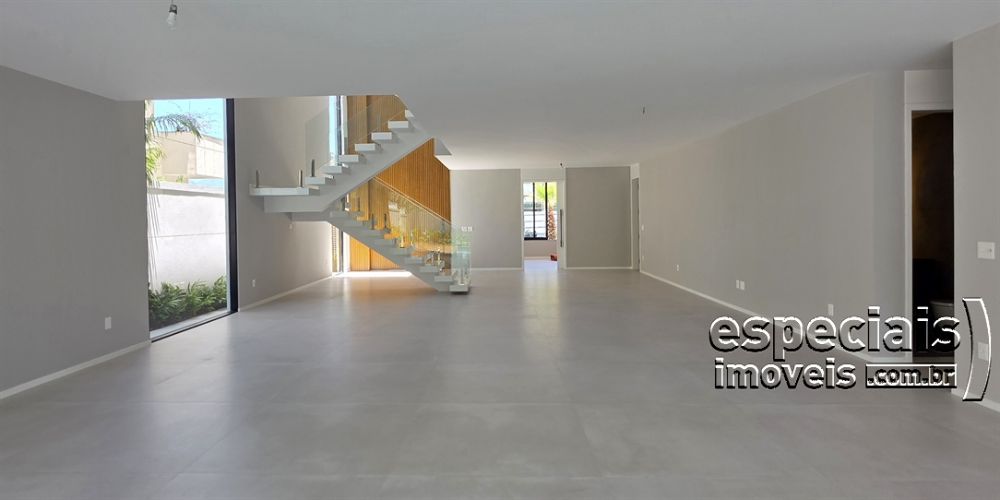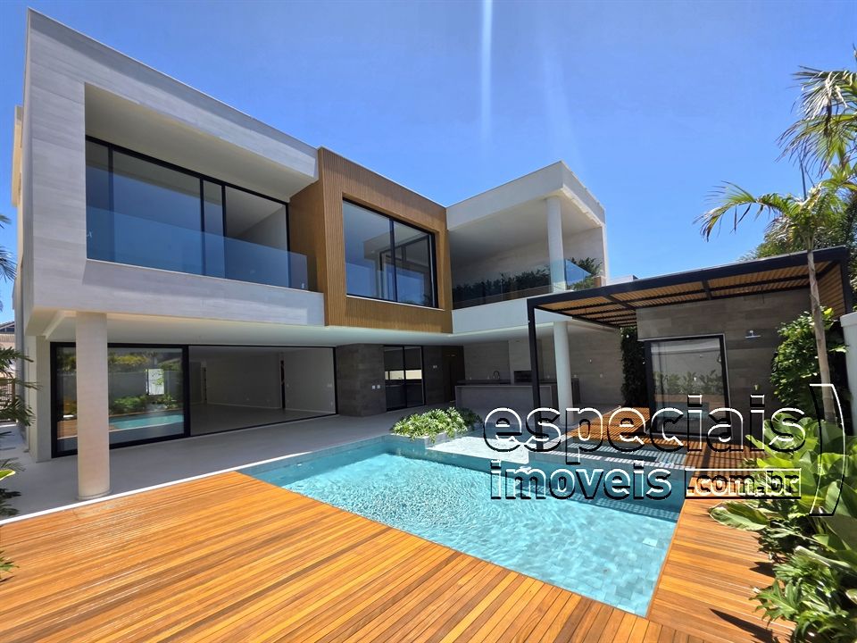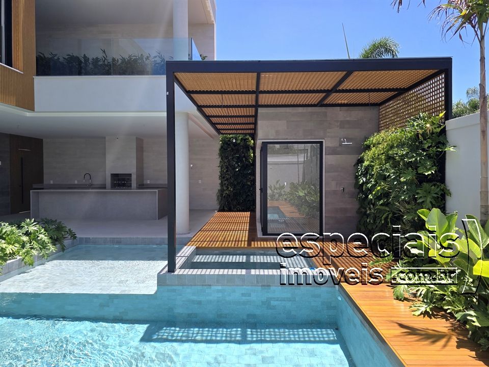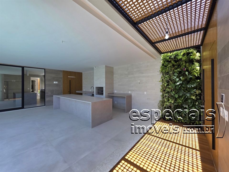 Primeiro pavimento: Hall social. Salão multiambiente com pé direito triplo. Lavabo. 1 Suíte. Copa. Cozinha com ilha. Área gourmet coberta com bancada completa (churrasqueira, forno a lenha e implementos) e ilha. Sauna. Banheiro de apoio. Deck, piscina e hidromassagem. Área de serviço/lavanderia e dependência completa de funcionários.