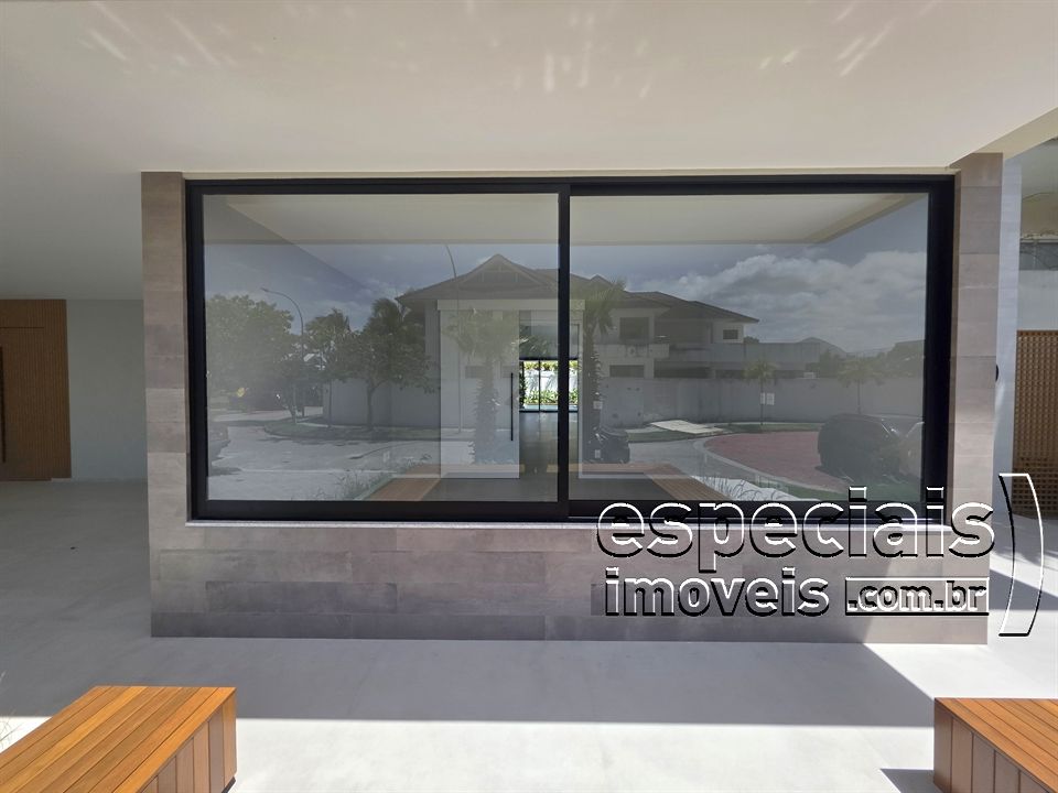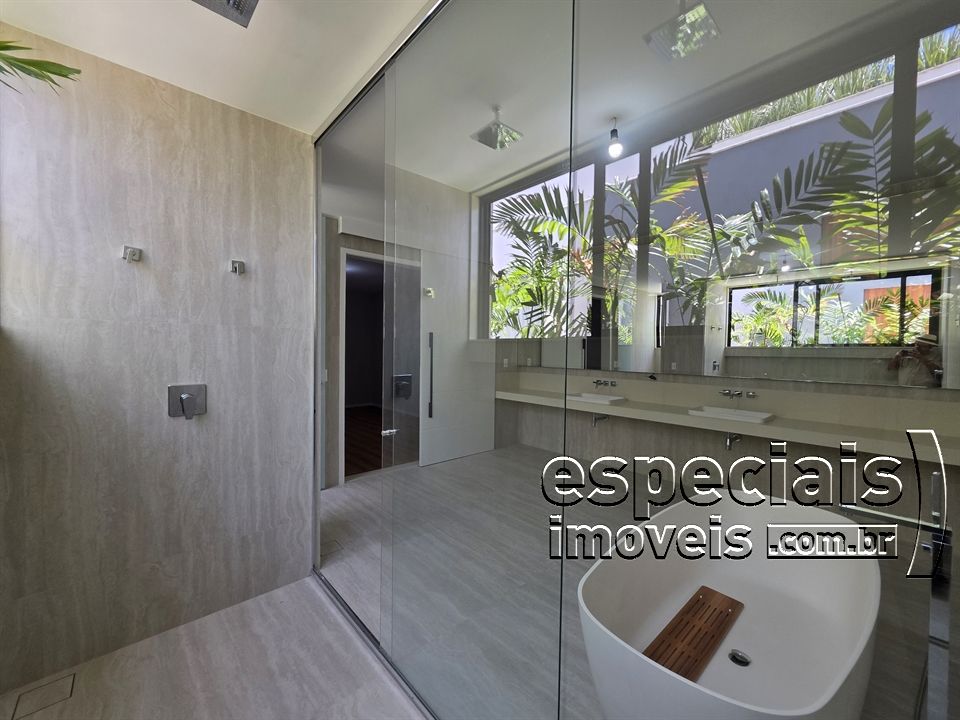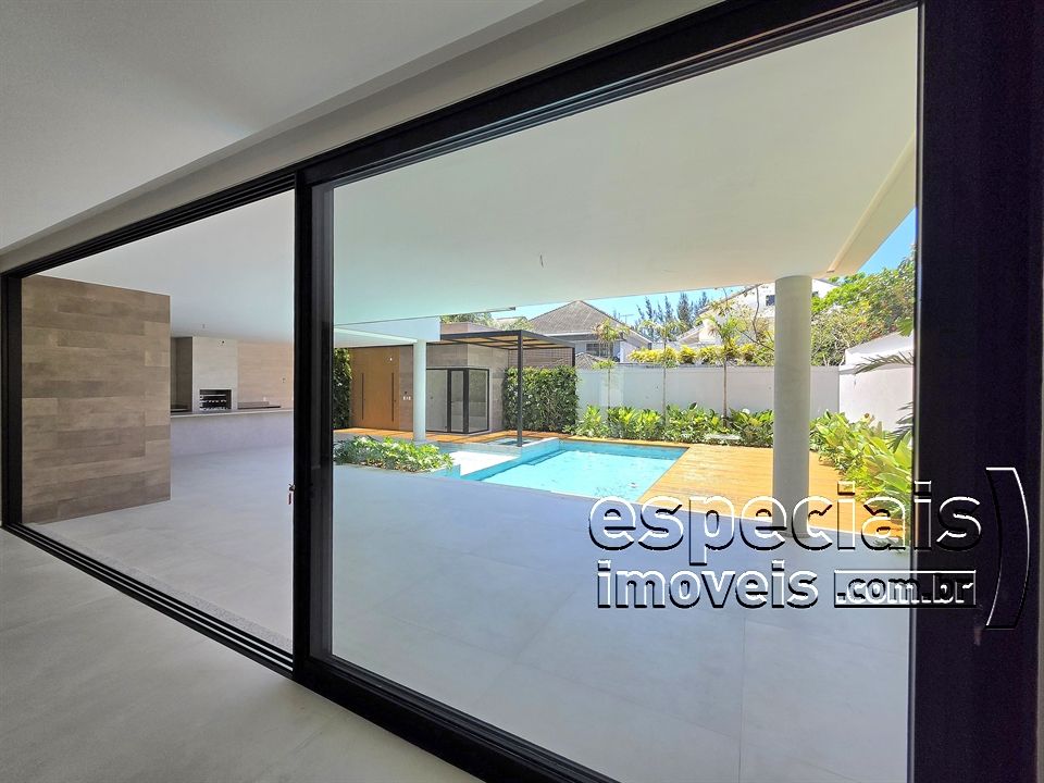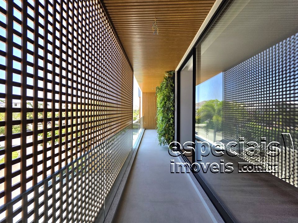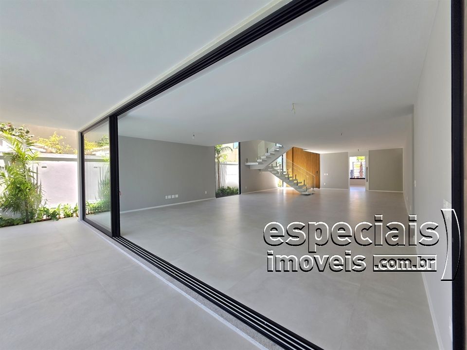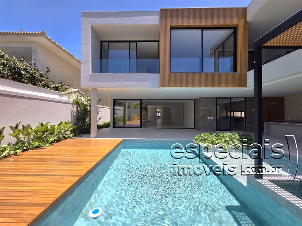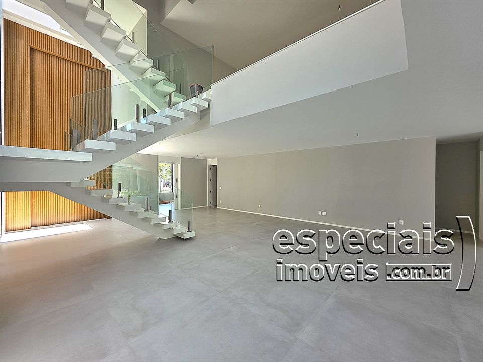 Primeiro pavimento: Hall social. Salão multiambiente com pé direito triplo. Lavabo. 1 Suíte. Copa. Cozinha com ilha. Área gourmet coberta com bancada completa (churrasqueira, forno a lenha e implementos) e ilha. Sauna. Banheiro de apoio. Deck, piscina e hidromassagem. Área de serviço/lavanderia e dependência completa de funcionários.