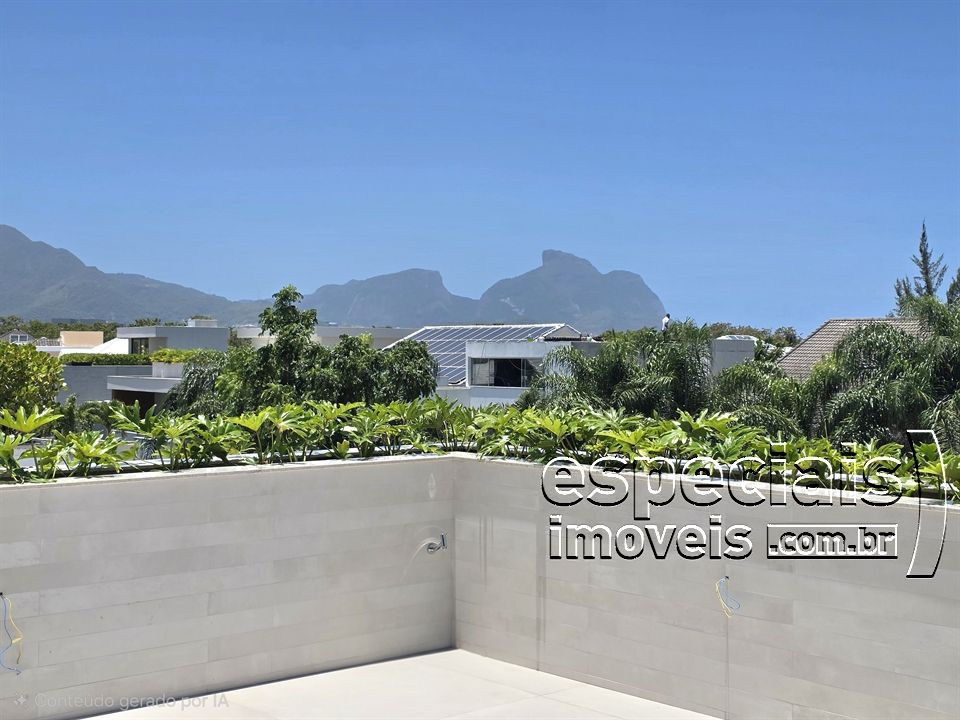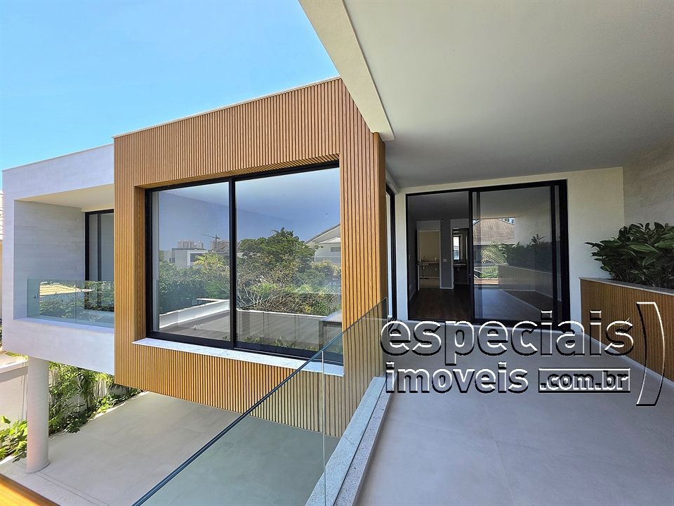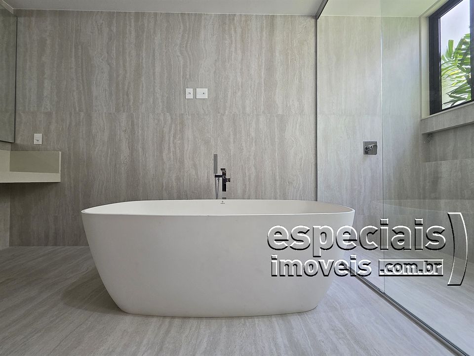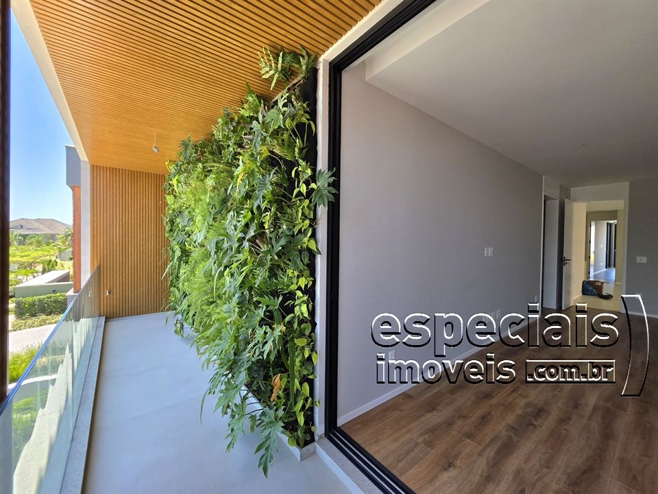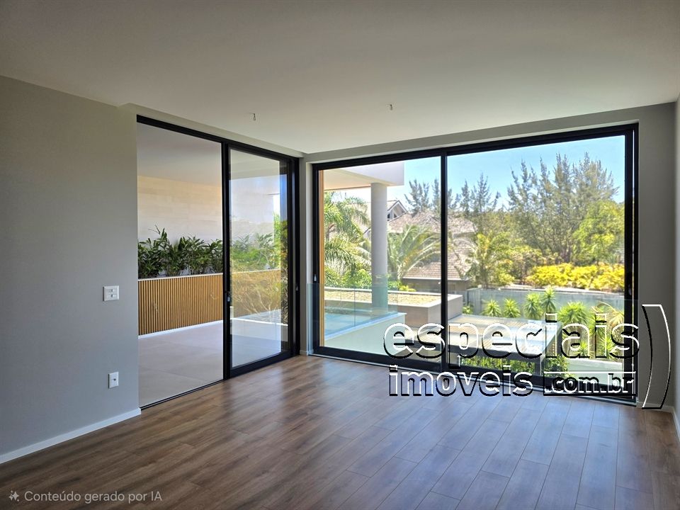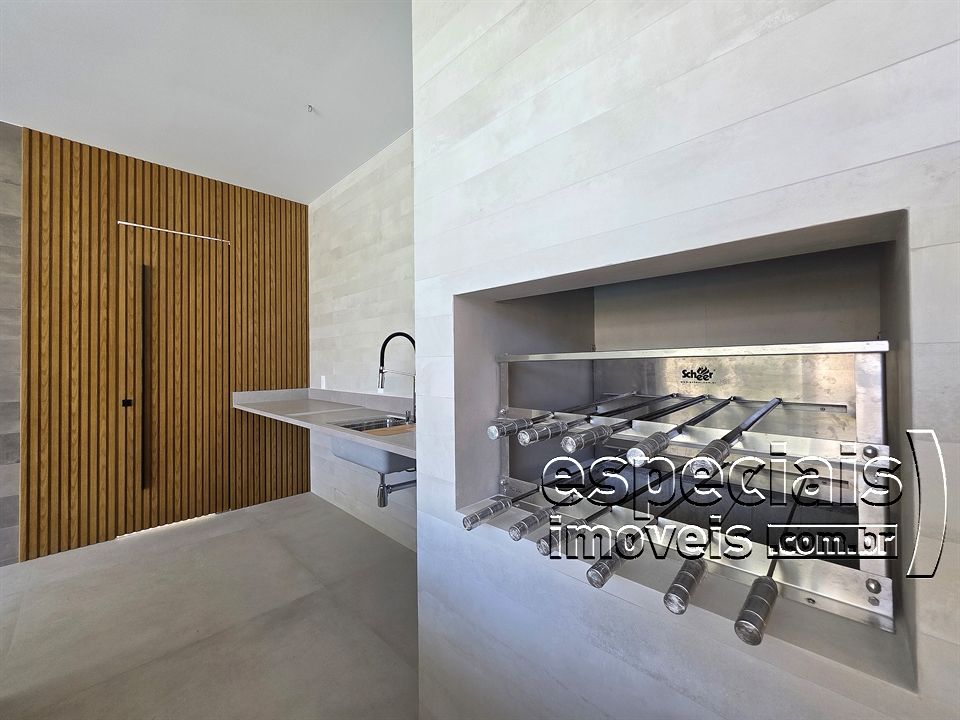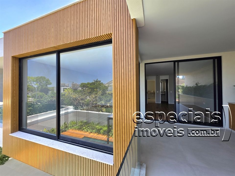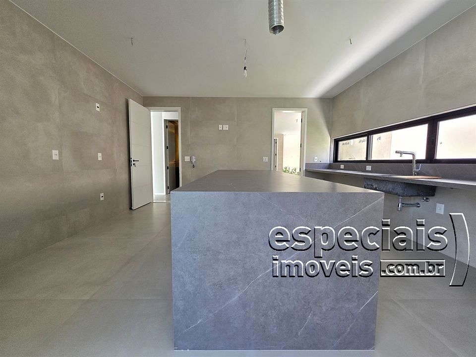 Primeiro pavimento: Hall social. Salão multiambiente com pé direito triplo. Lavabo. 1 Suíte. Copa. Cozinha com ilha. Área gourmet coberta com bancada completa (churrasqueira, forno a lenha e implementos) e ilha. Sauna. Banheiro de apoio. Deck, piscina e hidromassagem. Área de serviço/lavanderia e dependência completa de funcionários.