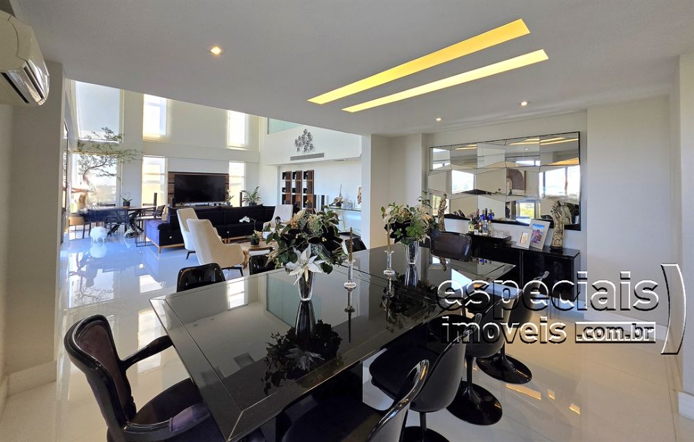 Primeiro pavimento: Hall social. Salão multiambiente com pé direito duplo. Sala de jantar. Lavabo. Varanda. Copa, cozinha, área de serviços. Suíte de funcionários.