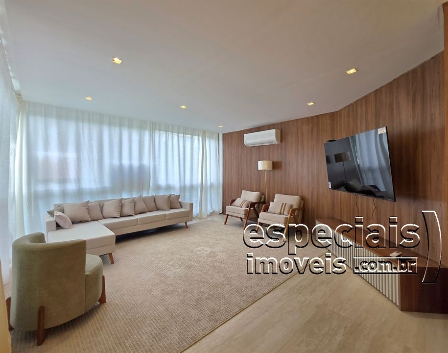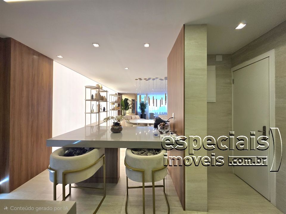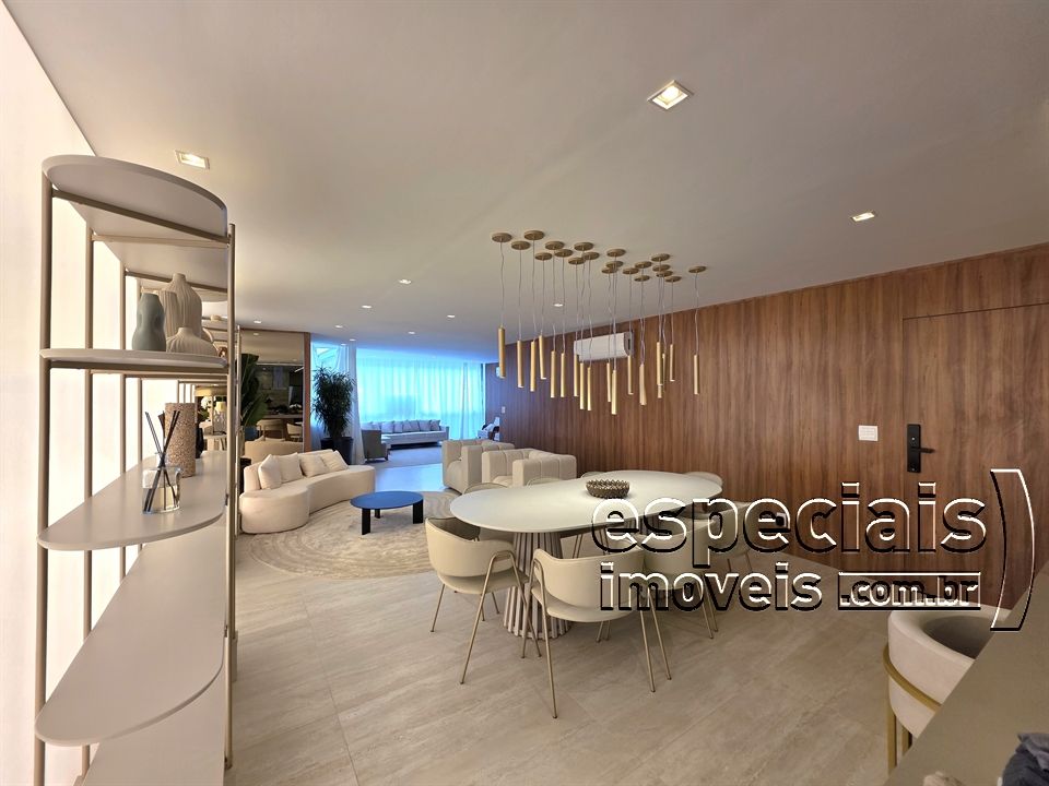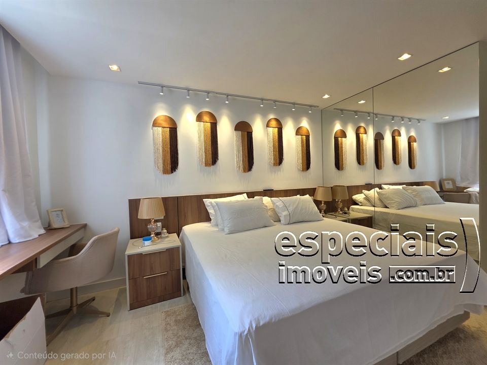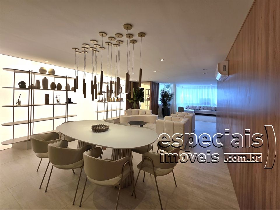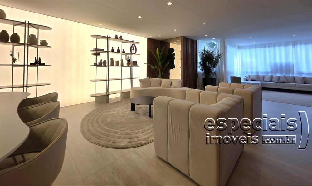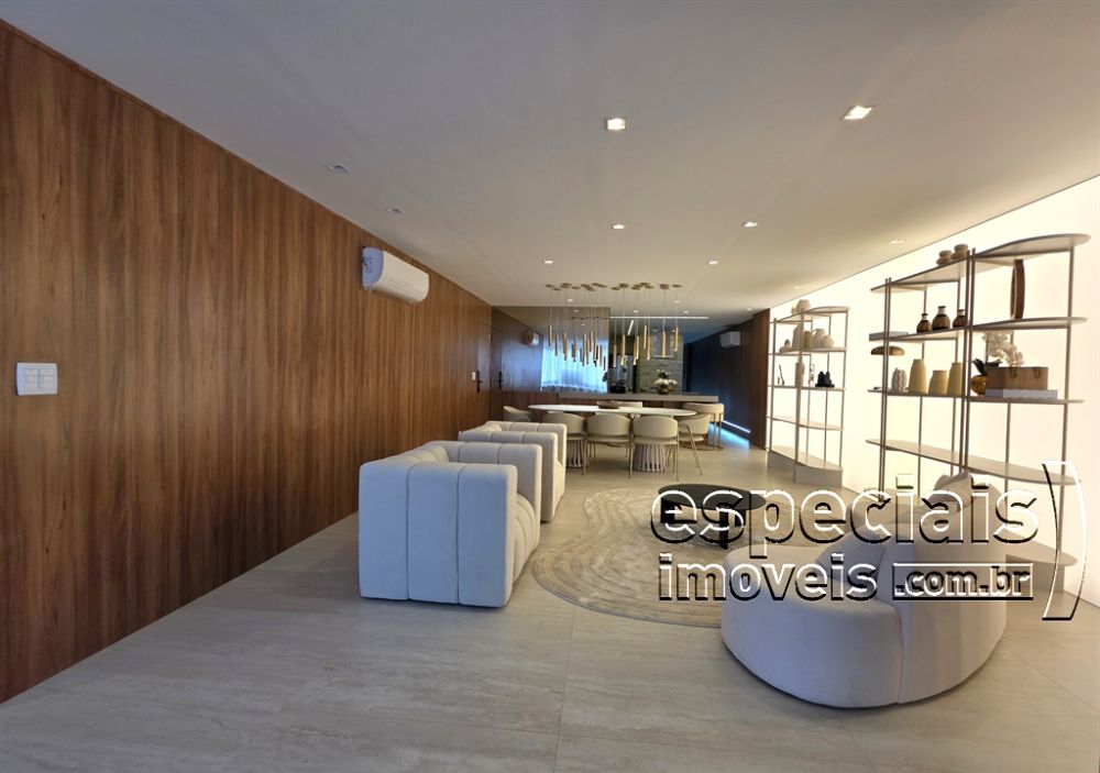 Composto de: Hall social. Salão multiambiente (estar e jantar). Varanda com fechamento em cortina de vidro. Lavabo. Roupeiro. 4 Suítes. Copa e cozinha integradas à sala. Área de serviços, quarto e banheiro de funcionários.