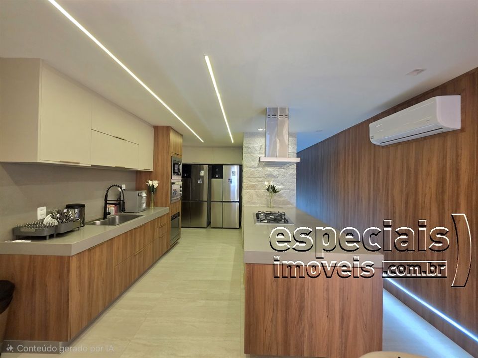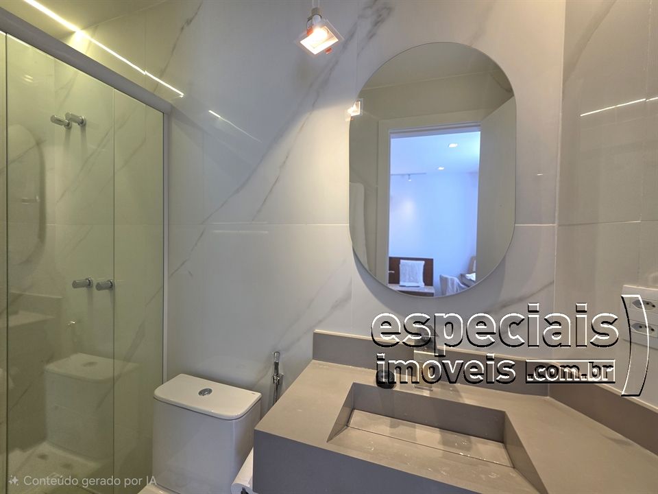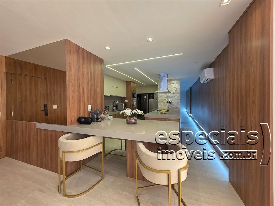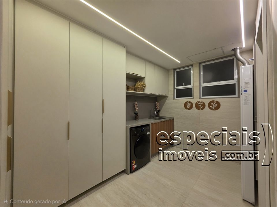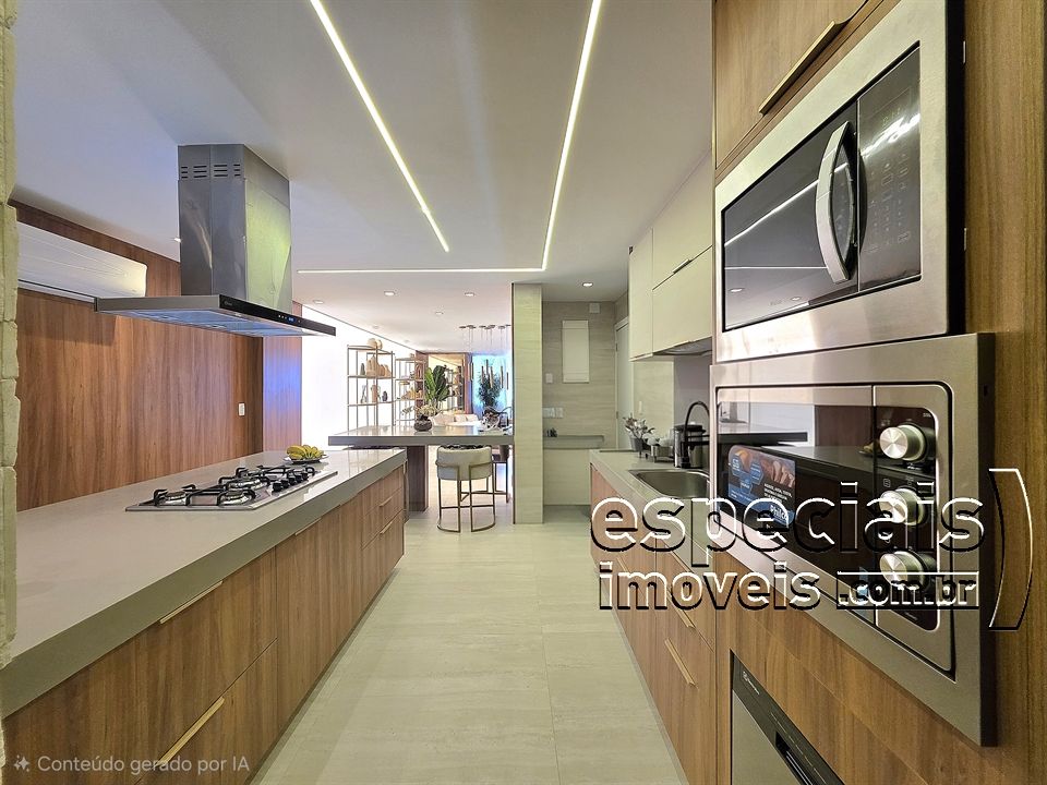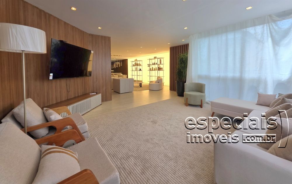 Composto de: Hall social. Salão multiambiente (estar e jantar). Varanda com fechamento em cortina de vidro. Lavabo. Roupeiro. 4 Suítes. Copa e cozinha integradas à sala. Área de serviços, quarto e banheiro de funcionários.